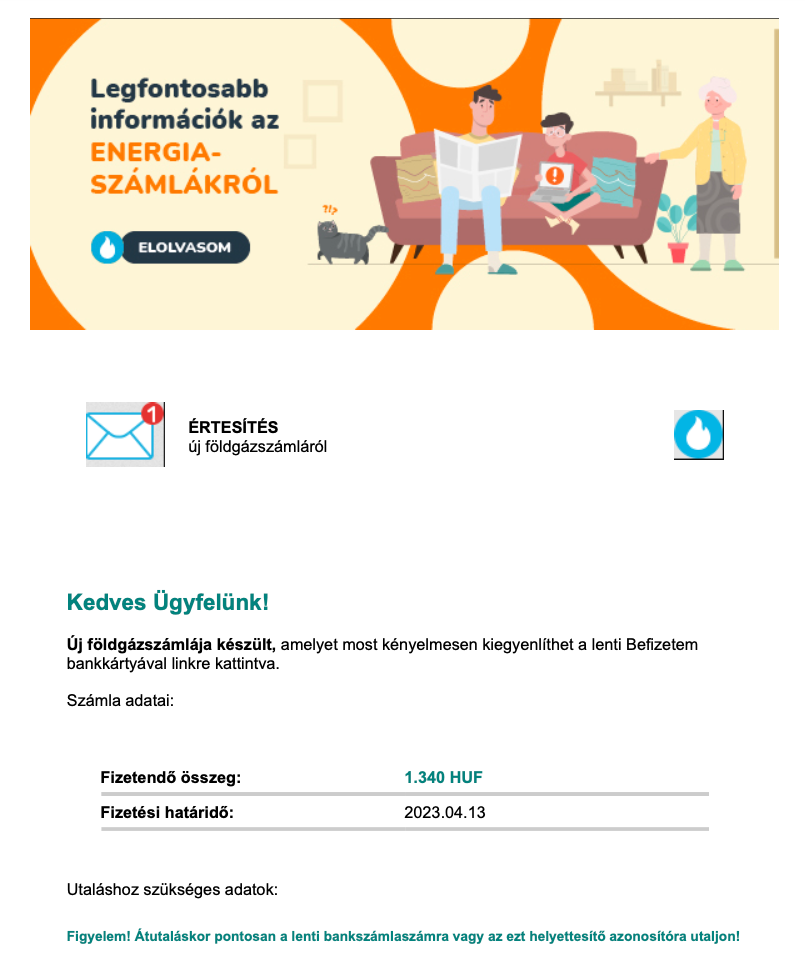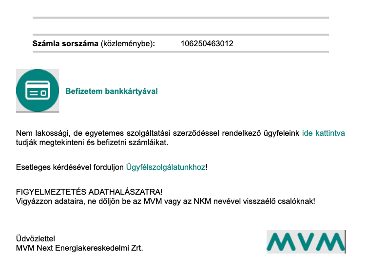 Ha úgy véljük, hogy akár valós is lehet az email, akkor ellenőrizzük a feladó email címét, az email tartalmát (vannak-e helyesírási hibák, rossz minőségű képek, amik gyanúsak lehetnek). Valószínűleg lesznek hivatkozások az emailben, melyek külső oldalakra mutatnak. Ha ezekre visszük a kurzort – ne kattintsunk rá (!) -, ellenőrizzük a hivatkozás címét. Ha gyanús az link (pl. a lenti képen látható cím is átverés), töröljük az emailt. Amennyiben az email kliensben nem jelent meg a hivatkozás, és a fenti mérlegelés után továbbra is úgy ítéljük meg, hogy releváns lehet számunkra az adott email, jobb klikkel (!) kattintsunk a hivatkozásra és másoljuk ki a címet, majd másoljuk be egy szövegszerkesztőbe (pl. Jegyzettömb / Notepad / TextEdit / stb.). Nagyon fontos, hogy ne kattintsunk rá a linkre, amíg nem győződtünk meg arról, hogy hivatalos szolgáltatótól érkezett, és nem csalás! A következő képeket megvizsgálva azt gondolhatnánk, hogy az MVM Next Energiakereskedelmi Zrt. írt nekünk egy valós földgázszámlával kapcsolatban. Az email formázása szinte tökéletesen megfelelnek az MVM oldalán használt design elemekkel. Milyen “kedvesek”, az email végén még figyelmeztetnek is, hogy vigyázzunk az adathalászokkal. Azonban ha a “Befizetem” gombra kattintanánk, azonnal megtörténne az adathalászat, vagy akár egy vírusprogramot is telepíthetnek a gépünkre. A gomb mögött a hivatkozás a következő oldalra mutat (még véletlenül sem kattintható formában mutatjuk most, nehogy véletlenül rákattintson valaki, hiszen itt egy csaló weboldalról van szó):